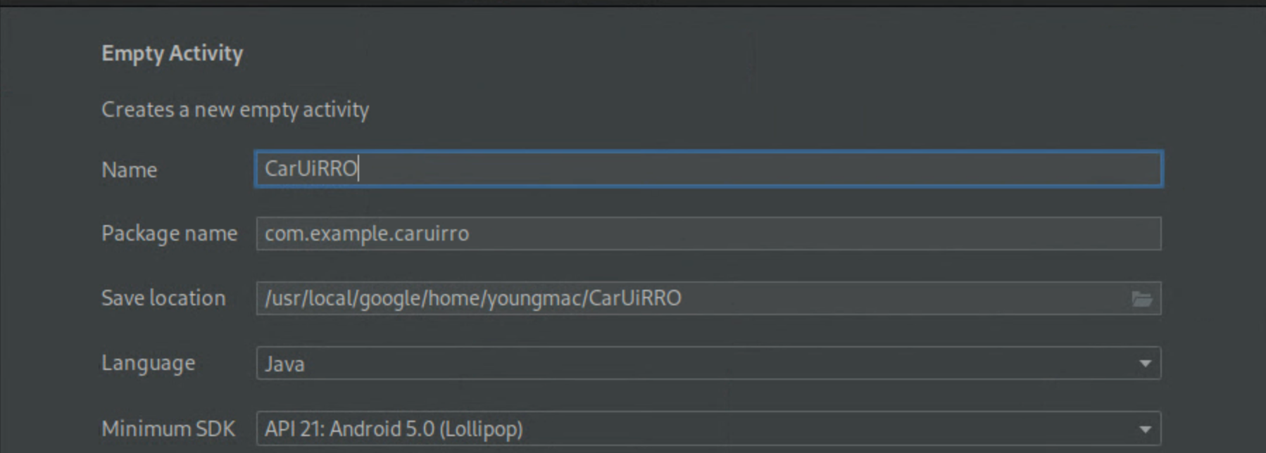 CarUiCodelabبگذارید و سپس زبان جاوا را انتخاب کنید. در صورت تمایل می توانید محل فایل را نیز انتخاب کنید. مقادیر پیش فرض را برای تنظیمات باقیمانده بپذیرید.