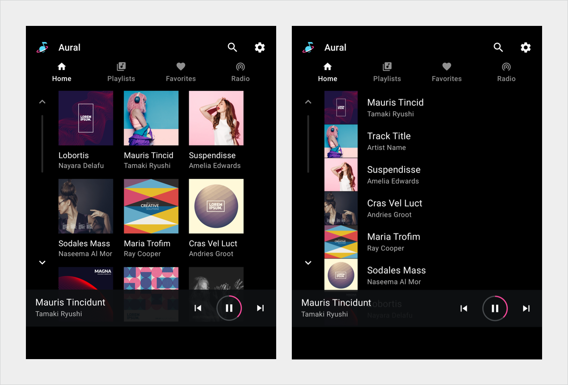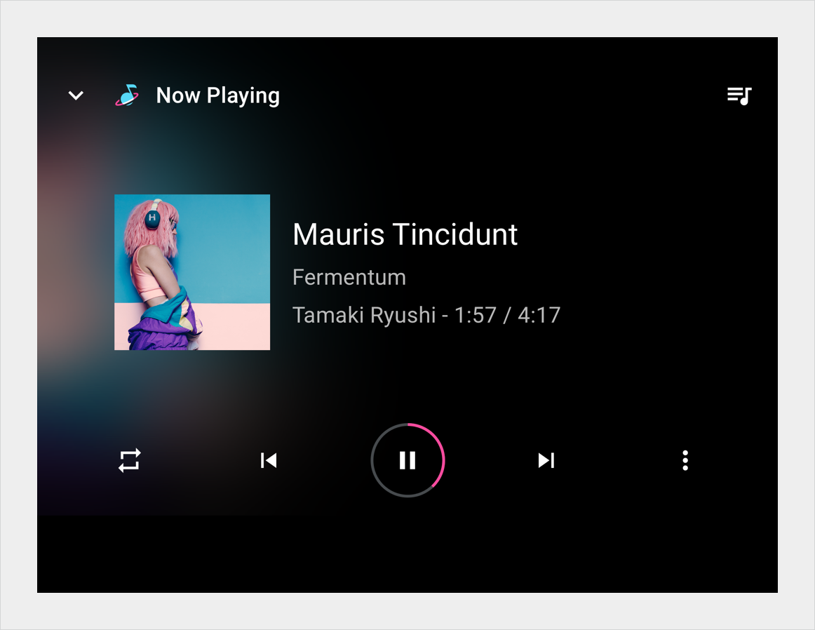 제목, 앨범 아트 등의 미디어 메타데이터를 표시하는 미디어 카드를 구현합니다. 미디어 카드에는 재생목록과 같은 미디어 항목의 현재 재생목록도 표시할 수 있습니다.