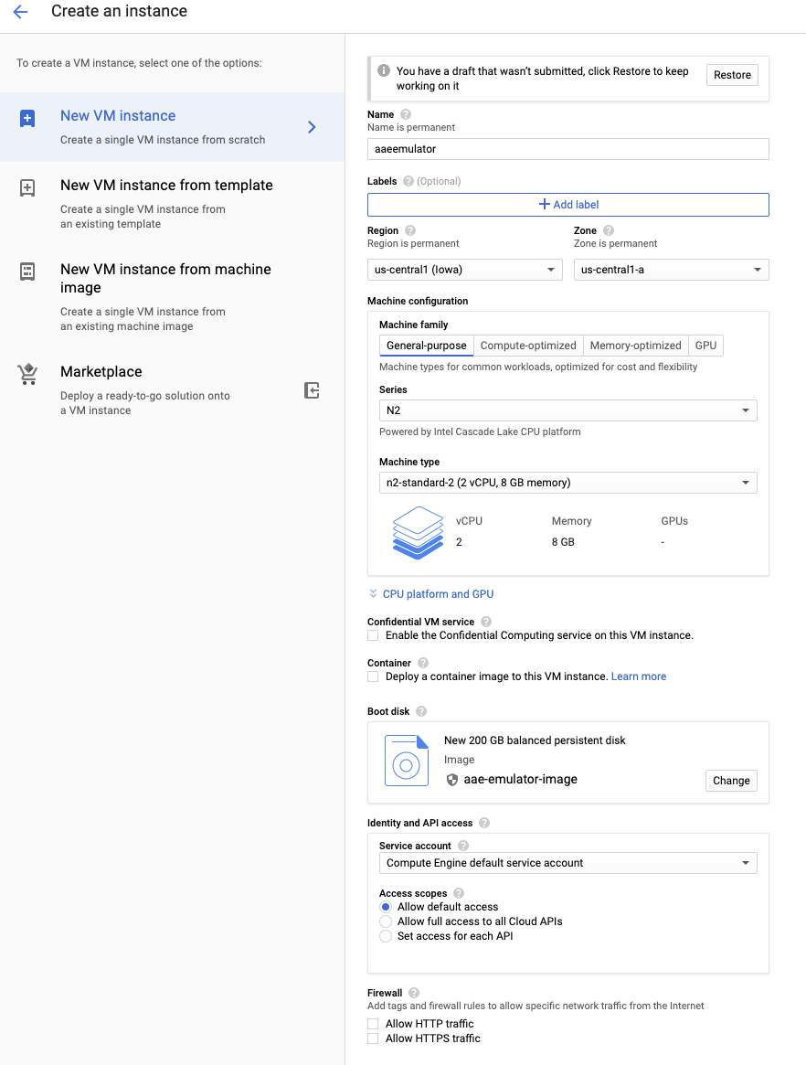 gcloud compute images create aaos-emulator-image --source-disk-zone us-central1-a \ --source-disk ubuntu1804lts \ --licenses \ "https://www.googleapis.com/compute/v1/projects/vm-options/global/licenses/enable-vmx" - أدخِل اسم الصورة. على سبيل المثال،