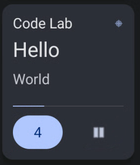private var progressOn = false private var progressTimer: Timer? = null private var progressCounter = 0 override fun onAppCardRemoved(id: String) { when (id) { APPCARD_ID -> { clickCounter = 0 progressCounter = 0 progressTimer?.cancel() } } } private fun createAppCard(appCardContext: AppCardContext): ImageAppCard { val buttonImageSize = appCardContext.imageAppCardContext.getMaxImageSize(Button::class.java) val progressPlayPauseImage = resToBitmap( if (progressOn) { android.R.drawable.ic_media_pause } else { android.R.drawable.ic_media_play }, buttonImageSize.width, buttonImageSize.height ) ... .setProgressBar( createProgressBar() ) .addButton( Button.newBuilder( "progressButton", Button.ButtonType.NO_BACKGROUND, object : OnClickListener { override fun onClick() { progressOn = !progressOn if (progressOn) { progressTimer = Timer() progressTimer?.scheduleAtFixedRate(object : TimerTask() { override fun run() { progressCounter++ if (progressCounter > 60) progressCounter = 0 sendAppCardComponentUpdate(APPCARD_ID, createProgressBar()) } }, SECONDS_TO_MS, SECONDS_TO_MS) } else { progressTimer?.cancel() progressTimer = null } sendAppCardUpdate(createAppCard(appCardContext)) } } ) .setImage( Image.newBuilder("buttonImage") .setContentScale(Image.ContentScale.FILL_BOUNDS) .setColorFilter(Image.ColorFilter.TINT) .setImageData(progressPlayPauseImage) .build() ) .build() ) ... } private fun createProgressBar(): ProgressBar { return ProgressBar.newBuilder(PROGRESS_BAR_ID, 0, 60) .setProgress(progressCounter) .build() } companion object { ... private const val PROGRESS_BAR_ID = "progress" private const val SECONDS_TO_MS = 1000L }