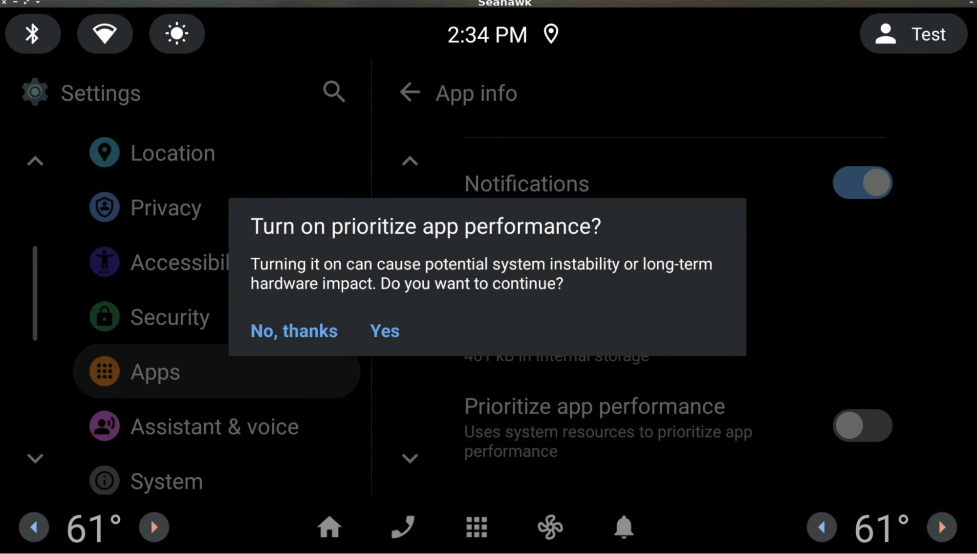 「設定」頁面包含 Prioritize app performance 的設定 (請見下圖),使用者可透過這些設定,優先考量應用程式效能,而非系統和長期硬體效能。這項設定僅適用於資源用量過高時可安全終止的應用程式。否則這項設定會停用。如果為應用程式關閉這項設定 (預設設定),應用程式可能會因資源用量過高而終止。否則,應用程式不會因資源過度使用而終止。