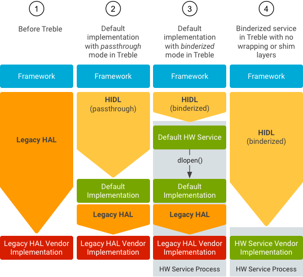 libhardware HAL から HIDL HAL に移行すると、HAL 実装がサーバーになり、HAL を呼び出すプロセスがクライアントになります。デフォルトの実装では、パススルーとバインドされた HAL の両方を提供し、次のように段階的に変更することが考えられます。