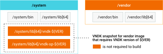 Ab Android 9 enthalten neue Android-Versionen mindestens einen Snapshot der VNDK-Core- und VNDK-SP-Verzeichnisse für ältere Versionen im Android-Quellcode. Bei der Build-Erstellung werden die erforderlichen Snapshots in /system/lib[64]/vndk-${VER} und /system/lib[64]/vndk-sp-${VER} installiert (Verzeichnisse, die von der Anbieterpartition verwendet werden können). Dabei ist ${VER} die Stringvariable, die den Versionsnamen des VNDK-Snapshots darstellt.