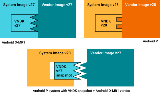VNDK-Snapshots können von einem System-Image verwendet werden, um Anbieter-Images die richtigen VNDK-Bibliotheken zur Verfügung zu stellen, auch wenn System- und Anbieter-Images aus verschiedenen Android-Versionen erstellt werden. Zum Erstellen eines VNDK-Snapshots müssen VNDK-Bibliotheken als Snapshot erfasst und mit einer Versionsnummer gekennzeichnet werden. Das Anbieter-Image kann mit einer bestimmten VNDK-Version verknüpft sein, die die erforderlichen ABIs für die Module im Anbieter-Image bereitstellt. Innerhalb derselben VNDK-Version müssen die VNDK-Bibliotheken jedoch ABI-stabil sein.