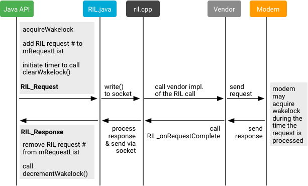 ملاحظة: للحصول على تفاصيل التنفيذ بشأن الدوال المستخدَمة في المخططات التالية، يُرجى الرجوع إلى الطرق acquireWakeLock() وdecrementWakeLock() وclearWakeLock( في ril.cpp.