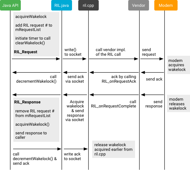 Nota: Para obtener detalles de implementación sobre las funciones que se usan en los siguientes diagramas, consulta los métodos acquireWakeLock(), decrementWakeLock() y clearWakeLock( en ril.cpp.
