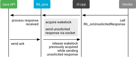 Trong trường hợp này, các phản hồi không mong muốn của RIL có một cờ loại wakelock trong đó cho biết liệu có cần thu được wakelock cho phản hồi của nhà cung cấp hay không. Nếu cờ được đặt, thì wakelock có thời gian sẽ được đặt và phản hồi sẽ được gửi qua một ổ cắm đến phía Java. Khi hết thời gian, wakelock sẽ được giải phóng. Thời gian đánh thức theo thời gian có thể quá dài hoặc quá ngắn đối với các phản hồi không mong muốn của RIL.