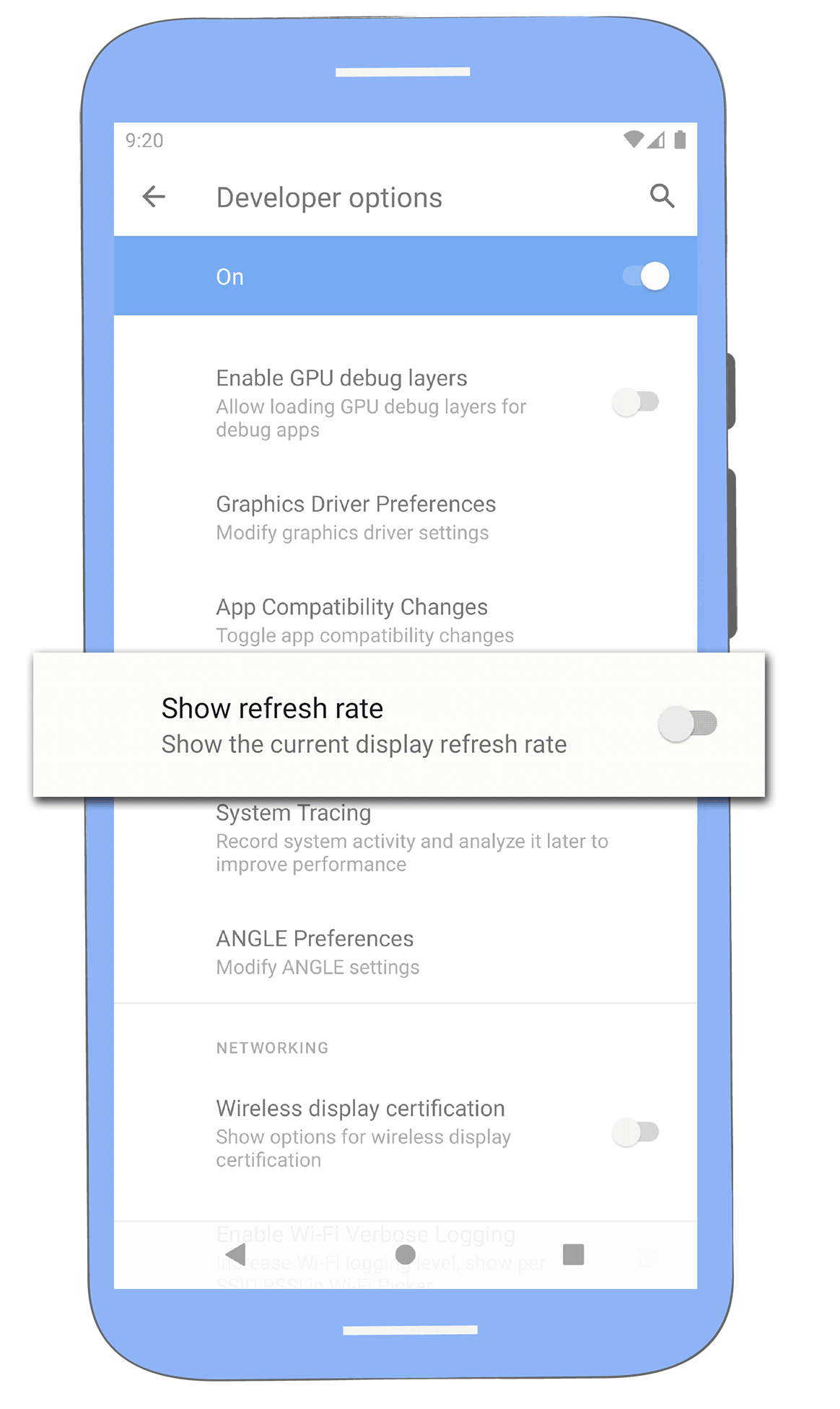 Do menu dodano nową opcję programisty, która włącza nakładkę na wyświetlaczu z bieżącą częstotliwością odświeżania. Nowa opcja znajduje się w sekcji Ustawienia > System > Opcje programisty > Pokaż częstotliwość odświeżania.
