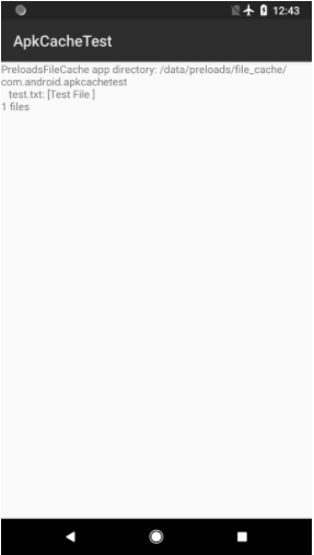 4. ऐप्लिकेशन की जांच करें. ऐप्लिकेशन इंस्टॉल करने और टेस्ट file_cache डायरेक्ट्री बनाने के बाद, ApkCacheTest ऐप्लिकेशन खोलें. इसमें एक फ़ाइल test.txt और उसका कॉन्टेंट दिखना चाहिए. यूज़र इंटरफ़ेस में ये नतीजे कैसे दिखते हैं, यह देखने के लिए यह स्क्रीनशॉट देखें.