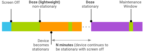 ב-Android מגרסה 7.0 ואילך, התכונה Doze מורחבת על ידי הפעלת מצב שינה קל במהלך השבתת המסך, לפני שהמכשיר יהיה במצב חוסר פעילות.