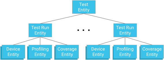 Her test modülü, bir varlık grubunun kökünü temsil eder. Test çalıştırma varlıkları hem bu grubun alt öğeleri hem de ilgili test ve test çalıştırma üst öğesiyle alakalı cihaz varlıkları, profil oluşturma noktası varlıkları ve kapsam varlıkları için ebeveynlerdir.