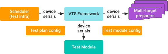زیرساخت تست (معمولاً زمانبندی تست) دستگاههای موجود را که الزامات مشخصشده در پیکربندی طرح آزمایشی را برآورده میکنند به چارچوب VTS اختصاص میدهد. دستگاه های اختصاص داده شده برای طرح تست رزرو می شوند حتی اگر ماژول تست از آنها استفاده نکند. باینریهای عامل VTS سپس به همه دستگاههای اختصاصیافته فشار داده میشوند و روی آنها اجرا میشوند (مگر اینکه بهطور خاص دستور داده نشده است که اجرا نشوند). این تضمین می کند که اتصالات TCP برای دستورات پوسته و HAL RPC برای همه دستگاه ها در یک اسکریپت آزمایشی در دسترس هستند.