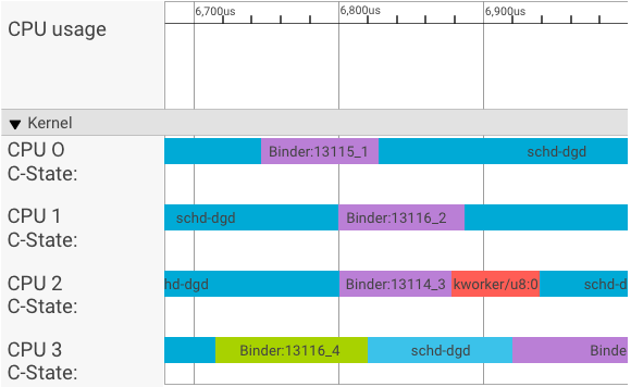 libhwbinder_latency -i 1 -v-------------------------------------------------- service pid: 8674 tid: 8674 cpu: 1 SCHED_OTHER 0-------------------------------------------------- main pid: 8673 tid: 8673 cpu: 1 -------------------------------------------------- client pid: 8677 tid: 8677 cpu: 0 SCHED_OTHER 0-------------------------------------------------- fifo-caller pid: 8677 tid: 8678 cpu: 0 SCHED_FIFO 99 -------------------------------------------------- hwbinder pid: 8674 tid: 8676 cpu: 0 ??? 99-------------------------------------------------- other-caller pid: 8677 tid: 8677 cpu: 0 SCHED_OTHER 0 -------------------------------------------------- hwbinder pid: 8674 tid: 8676 cpu: 0 SCHED_OTHER 0