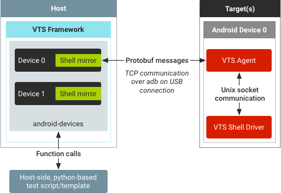 - Extensível. As comunicações de comando do shell entre o framework VTS e o driver do dispositivo são agrupadas em protobuf para permitir a possível compressão, acesso remoto, criptografia etc. no futuro. Outras possibilidades de melhoria de desempenho também estão disponíveis, incluindo a análise de resultados do dispositivo quando o overhead de comunicação se torna maior que a análise de strings de resultados.
