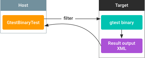 En VTS, el formato de prueba predeterminado son las pruebas de Python del host que se extienden desde BaseTest en el ejecutor de VTS. Para integrar pruebas del destino, primero debes enviar los archivos de prueba al dispositivo, ejecutar las pruebas con comandos de shell y, luego, analizar los resultados con secuencias de comandos de Python del host.