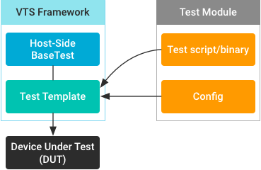 ב-VTS, פורמט ברירת המחדל של הבדיקה הוא בדיקות Python בצד המארח שמתרחבות מ-BaseTest ב-VTS runner. כדי לשלב בדיקות בצד היעד, קודם צריך לדחוף את קובצי הבדיקה למכשיר, להריץ את הבדיקות באמצעות פקודות מעטפת ולאחר מכן לנתח את התוצאות באמצעות סקריפטים של Python בצד המארח.
